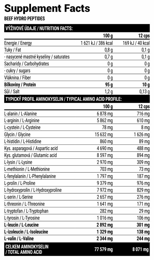 o výrobku podrobné informace nutriční hodnotyČisté hovězí peptidy izolované z prémiového hovězího hydrolyzátu HydroBEEF™. 95 % bílkovin a čisté složení bez zbytečností – pouze účinná látka a kapsle!