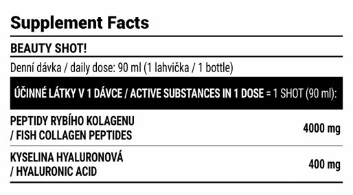 Wasser, Fisch-Kollagenpeptide, Säureregulator: Citronensäure, Aroma, Natriumhyaluronat, Konservierungsstoffe: Kaliumsorbat und Natriumbenzoat, Süßungsmittel: Sucralose.